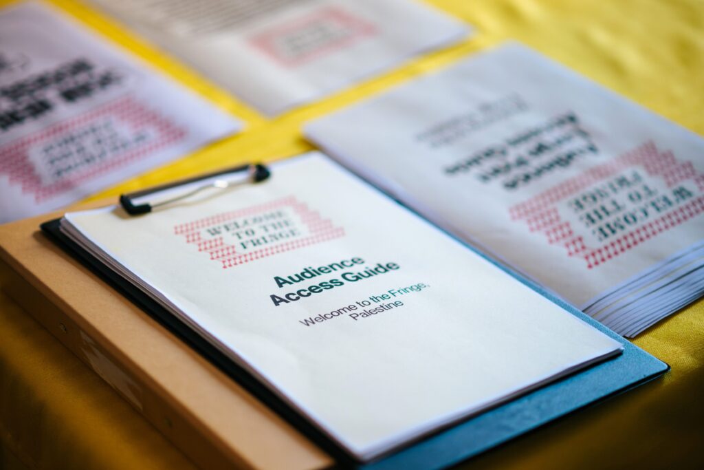 Amir Sabra’s Dabke Workshop supported by Imaginate and The Work RoomDiline Abushaban’s Gaza Food and StoriesSome of the Artists & Organisers from WTTF (left to right): Amal Kaawash, Sara Shaarawi, Misan Miso Samara, Amir Sabra, Dareen Tatour, Fadi Murad, Bruno Cruz, Anaghim Abbas, Nur Garabli, Mhari Robinson, Mohammed Moussa. Sara Shaarawi introducing a performance at the festivalAnn Bryce (volunteer) and audience settling at Portobello Town Hall. Audience Access Guide & resources produced by volunteers: Nelly Kelly, Star Gaze & Biff Nicolson. A team of volunteers staffed the Access Desk throughout the festival. Audience queue for tickets & merchandise. Some of the volunteers (and IAP staff): Fiona Sturgeon Shea, Magdalena Schamberger, Nina Doherty, Lucy Bartlett, Mhari RobinsonFlyer design by Conor O’TooleIAP staff: Nina Doherty & Chloe LythThe auditorium full of staff and audience. Volunteers Tickle McNicholl & Nelly Kelly.